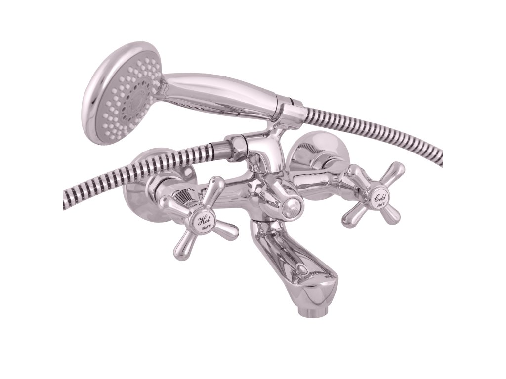 Vodovodní baterie vanová nástěnná s keramickým přepínačem, s vidlicí na odkládání sprchy a se sprchou.