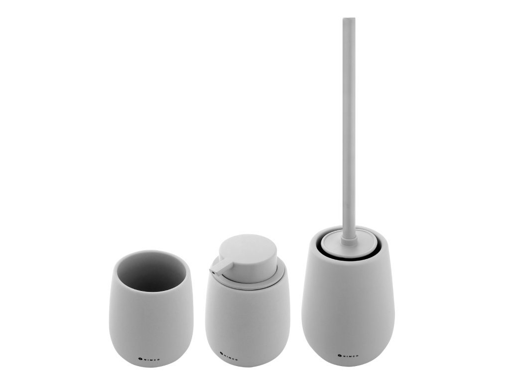 Sada doplňků do koupelny a WC obsahuje dávkovač tekutého mýdla, pohárek na zubní kartáčky a WC kartáč. Nádobky keramické světle šedé matné. Soft-touch povrch. Speciální dodatečná povrchová úprava. Povrch je hebký, příjemný na dotek.