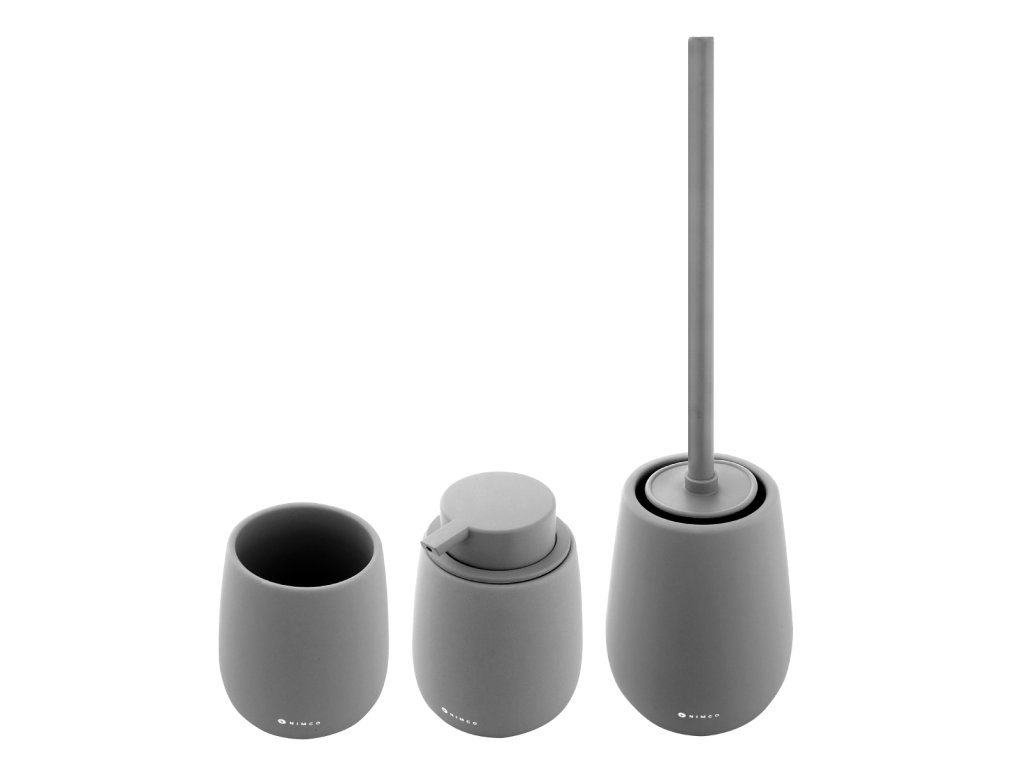 V sadě dávkovač tekutého mýdla, pohárek na kartáčky a WC kartáč. Nádobky keramické tmavě šedé matné. Objem dávkovače 425 ml. Pumpička plast. Rukojeť kartáče nerez ocel. Soft-touch povrch.