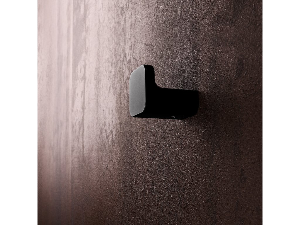 Sada koupelnových doplňků k umyvadlu. Nástěnný dávkovač tekutého mýdla, držák zubních kartáčků a háček na zavěšení ručníku ze série koupelnových doplňků Nimco Maya černá.