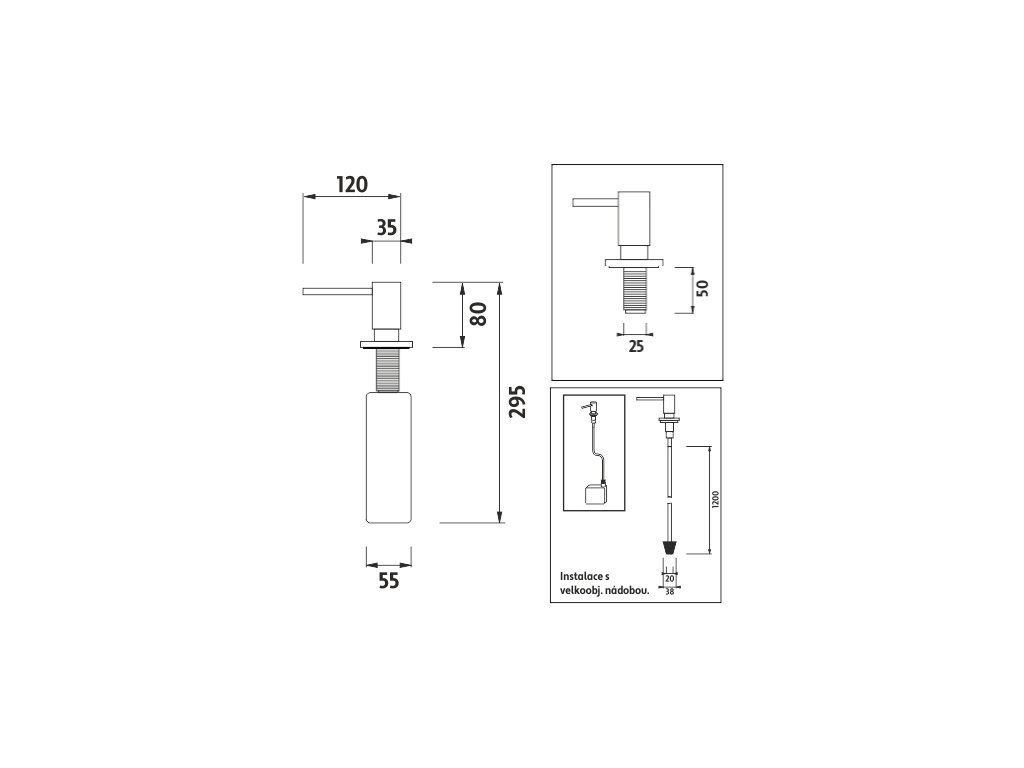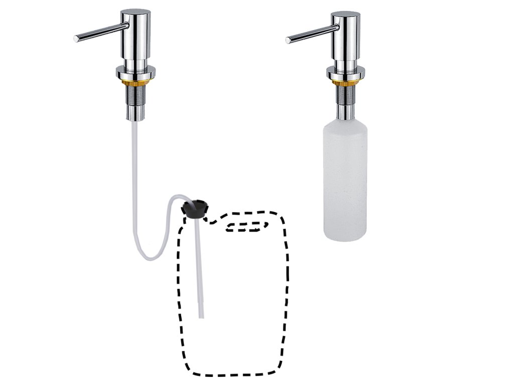 Vestavěný dávkovač saponátu, mýdla nebo dezinfekčního gelu do dřezu či umyvadla. Hlava pumpy průměr 35 mm. Plnění 350 ml nádobky shora vyjmutím pumpy.
