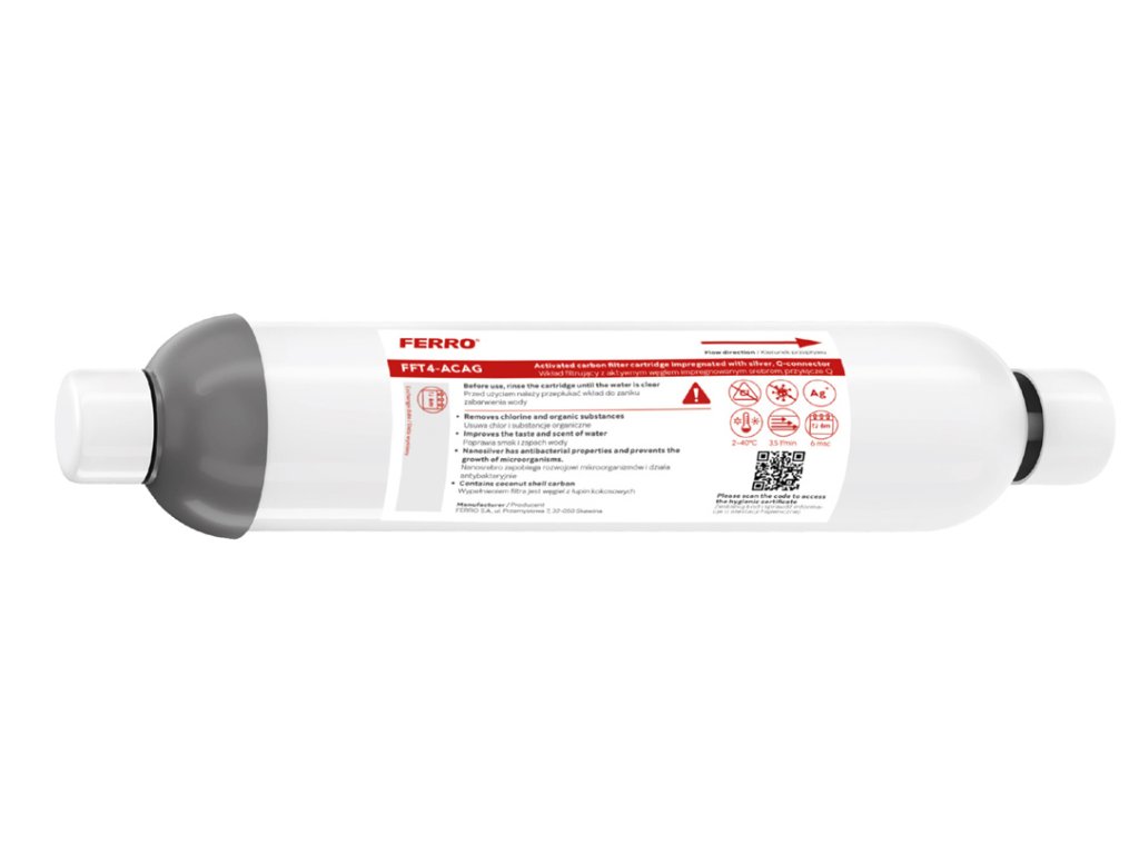 Filtr FFT4-ACAG je moderní řešení určené k výraznému zlepšení kvality vody z kohoutku. Je vybaven granulovaným aktivním uhlím impregnovaným stříbrem a účinně odstraňuje chlor, jeho deriváty a řadu organických sloučenin, které ovlivňují chuť a vůni vody. Díky tomu je každodenní používání vody jednoduše příjemnější. Přídavek nanostříbra má antibakteriální účinek – omezuje růst mikroorganismů uvnitř filtru a zajišťuje stabilní a hygienický provoz po celou dobu jeho životnosti. Toto řešení je obzvláště ceněno tam, kde je klíčová spolehlivost filtrace. Filtr je vybaven praktickou rychlospojkou 1/4", která zjednodušuje instalaci a zaručuje bezpečné a těsné spojení. Filtr FFT4-ACAG je plně kompatibilní s kuchyňskou baterií FILTRATA, čímž poskytuje účinný filtrační prvek a zlepšuje komfort každodenního používání vody v kuchyni.