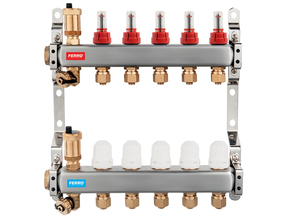ČESKÝ VÝROBEKNerezové rozdělovače pro 2-12 vytápěných okruhů osazené průtokoměry Taconova se zárukou 15 let. Kompletní sortiment příslušenství včetně náhradních dílů