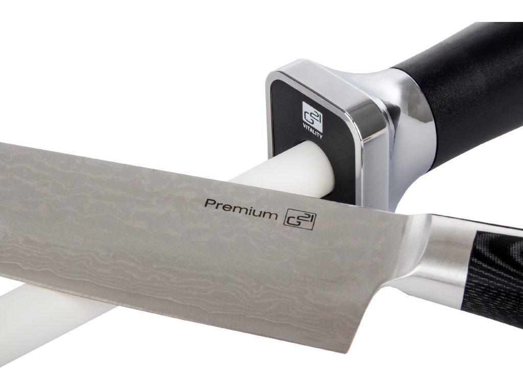 - Přiložte nůž tak, aby se čepelí dotýkal keramické brusné části ocílky pod správným úhlem (klasické nože 25–30 °, damaškové nože 20–25 °) a volným tahem přejíždějte ostřím nože po povrchu ocílky.
