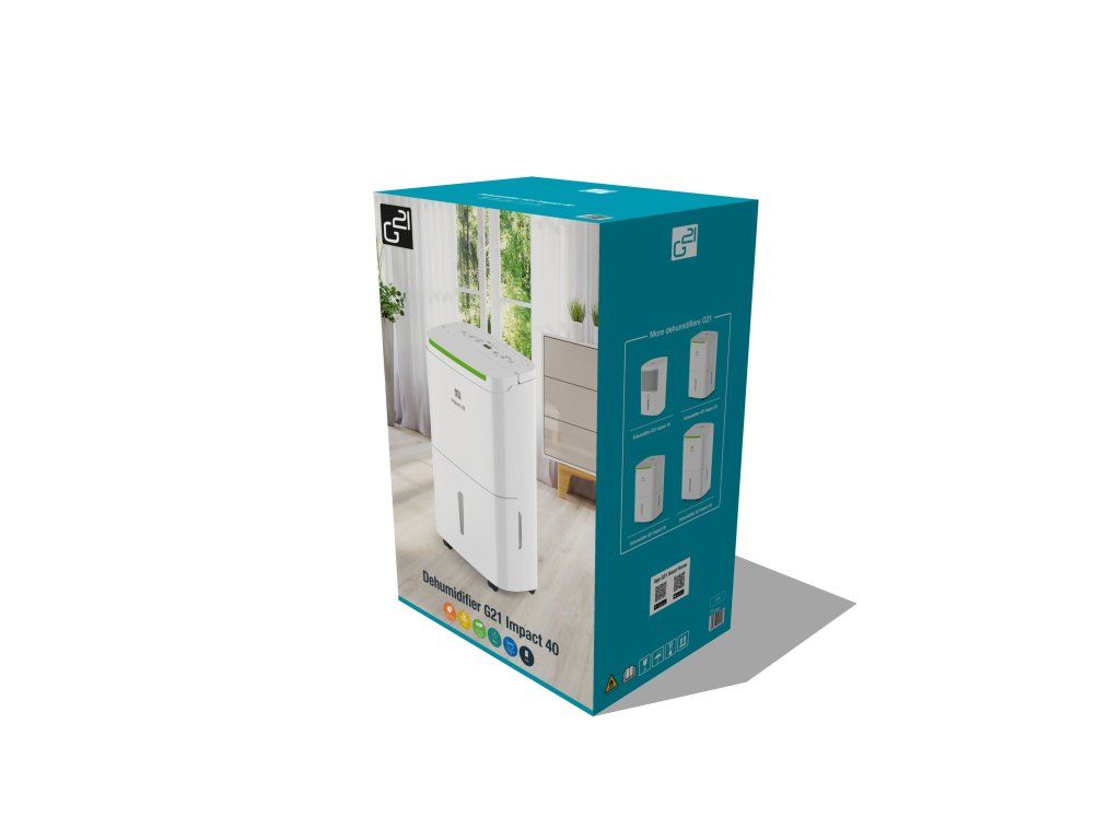 Odvlhčovač vzduchu G21 Impact 40 od české značky G21 má kapacitu 40 l za 24 hodin. Je vybaven 7l, dostatečně velkou nádržkou na kondenzát s průhledným indikátorem stavu. Pozorovat jej však ani nemusíte – odvlhčovač se při naplnění nádržky sám vypne. Odvlhčovač používá ekologické chladivo R290, které nepoškozuje ozónovou vrstvu.