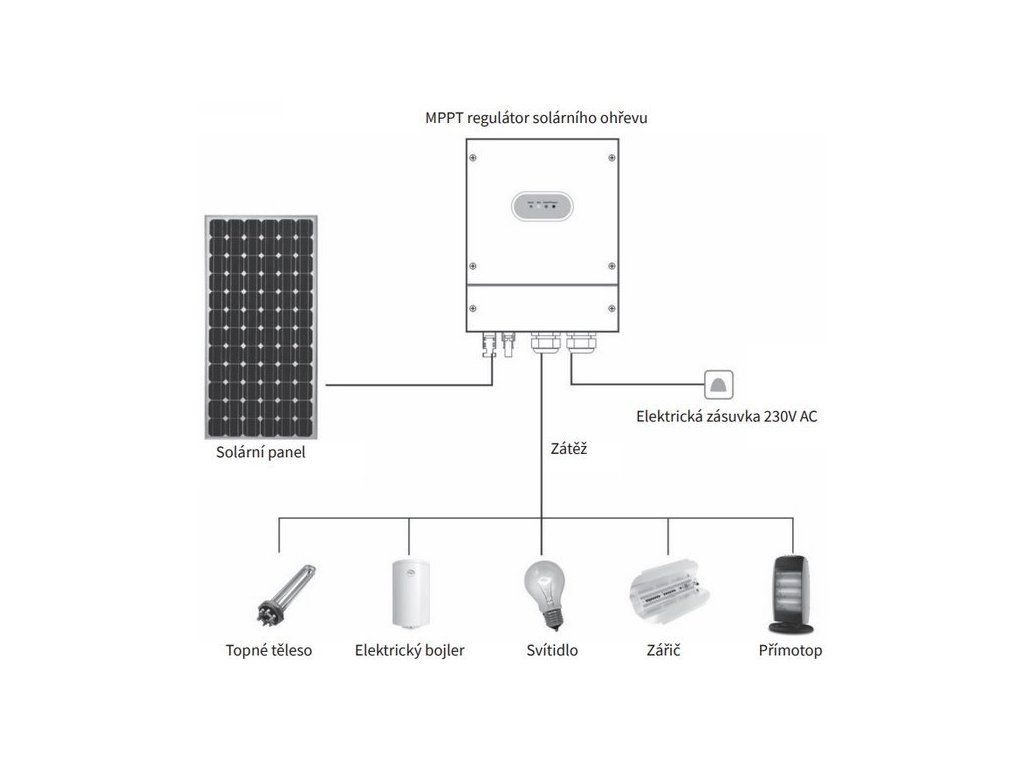 Vytvoření systému je jednoduché. K regulátoru připojíte fotovoltaické panely s výkonem maximálně 4 000 W a provozním napětím v rozmezí od 160 do 350 V DC. Zapojíte ho k síťovému napětí 230 V AC a s odporovou zátěží, tedy topnou spirálou, elektrickým bojlerem, radiátorem nebo podlahovým vytápěním.