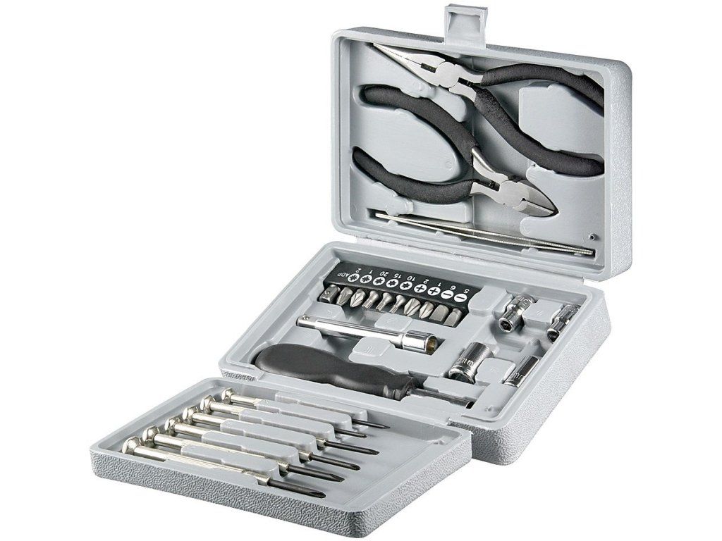 25dílná sada nářadí Fixpoint v praktickém kufříku obsahuje 6 mikro šroubováků, bitový šroubovák, 10 ks bitů + adaptér, 5 gola nástavců, 2 x kleště a pinzetu.Obsah balení: