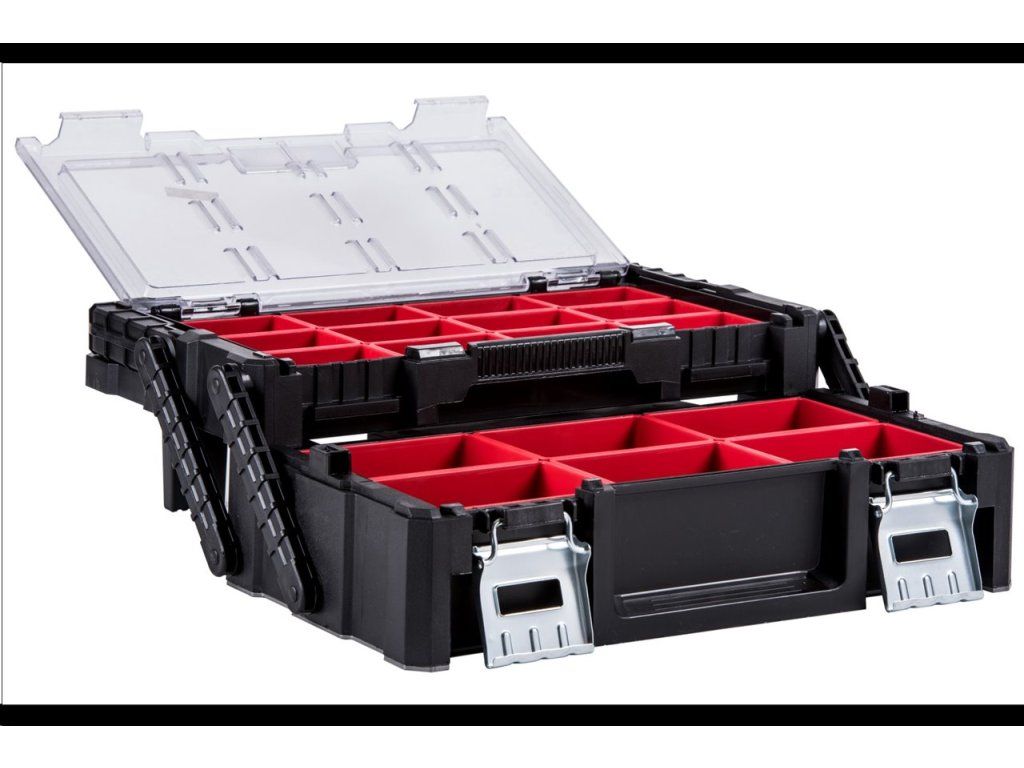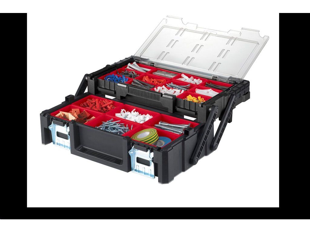 Konzolový systém udržuje všechny dílky v perfektním pořádku. Zároveň však nezvětšuje rozměry organizéru, který zůstává kompaktní a přehledný.