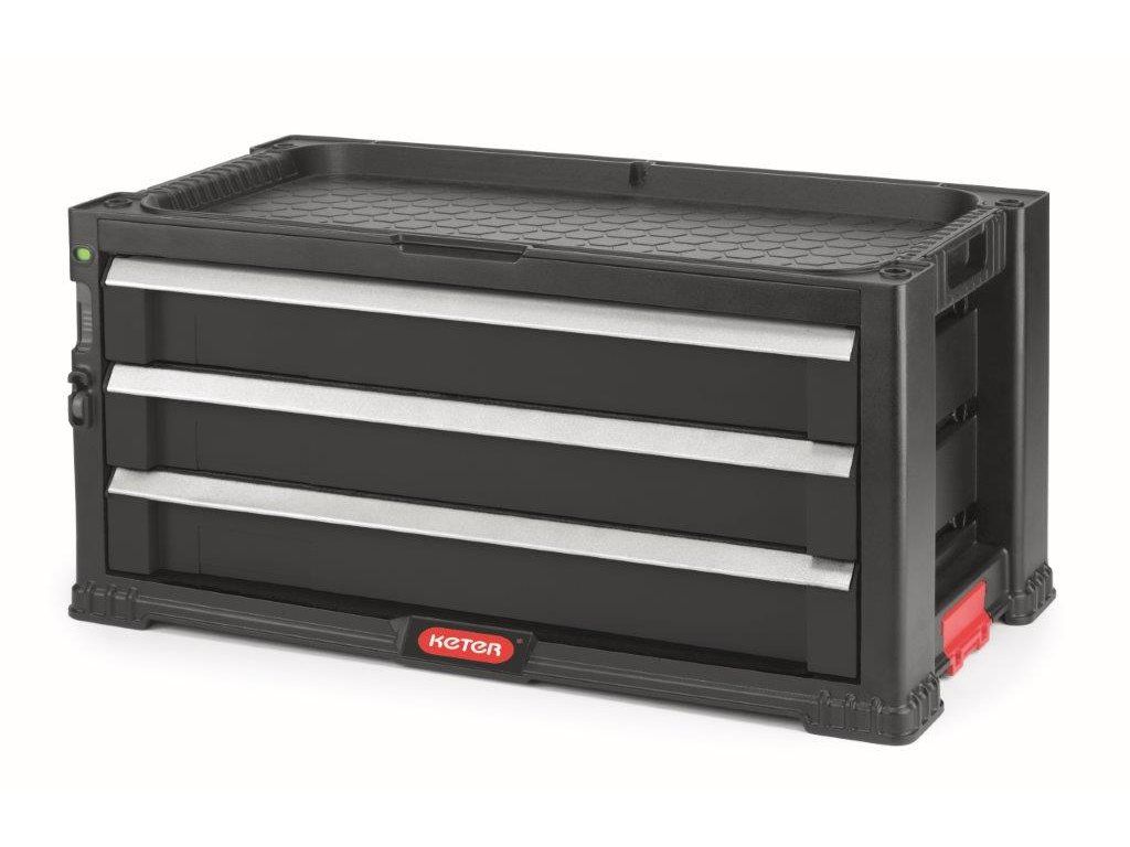 Úložný box na nářadí obsahuje 3 zásuvky pro uložení drobnějších nástrojů a příslušenství. Jedna ze tří zásuvek je vybavena 16 vyjímatelnými organizéry na drobné příslušenství, jako jsou hřebíky, šroubky, hmoždinky a jiné drobnosti. Organizéry umožňují snadné roztřídění příslušenství podle druhů a velikostí. Všechny dělící příčky v zásuvkách lze snadno vyjmout a vytvořit tak volný prostor pro větší nástroje. Modul se zásuvkami lze zajistit proti otevření vestavěným posuvným zámkem. Nechybí ani očko pro zajištění visacím zámkem.