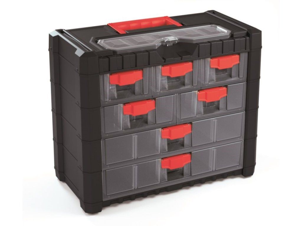 Nemůžete najít vhodné místo pro své nářadí? Válí se všude kolem a začíná to vadit vám nebo vaší druhé polovičce? Skříňka CARGO vyřeší váš problém s nedostatkem úložného prostoru a přijde vhod každému kutilovi. Se 7 zásuvkami snadno uschováte své náčiní a vždy ho budete mít nablízku. Praktická rukojeť usnadní přepravu nářadí kamkoliv budete potřebovat. Speciální ochrana chrání zásuvky před samovolným vypadnutím ze skříňky. Tento organizér se dá zavěsit na stěnu vaší dílny, garáže nebo skladu, čímž ušetříte ještě více místa.