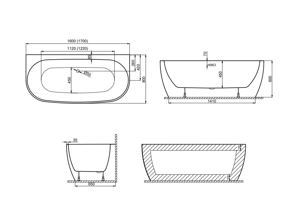 Polimat Risa volně stojící akrylátová vana, černý lesk Délka vany: 160cm, 00478