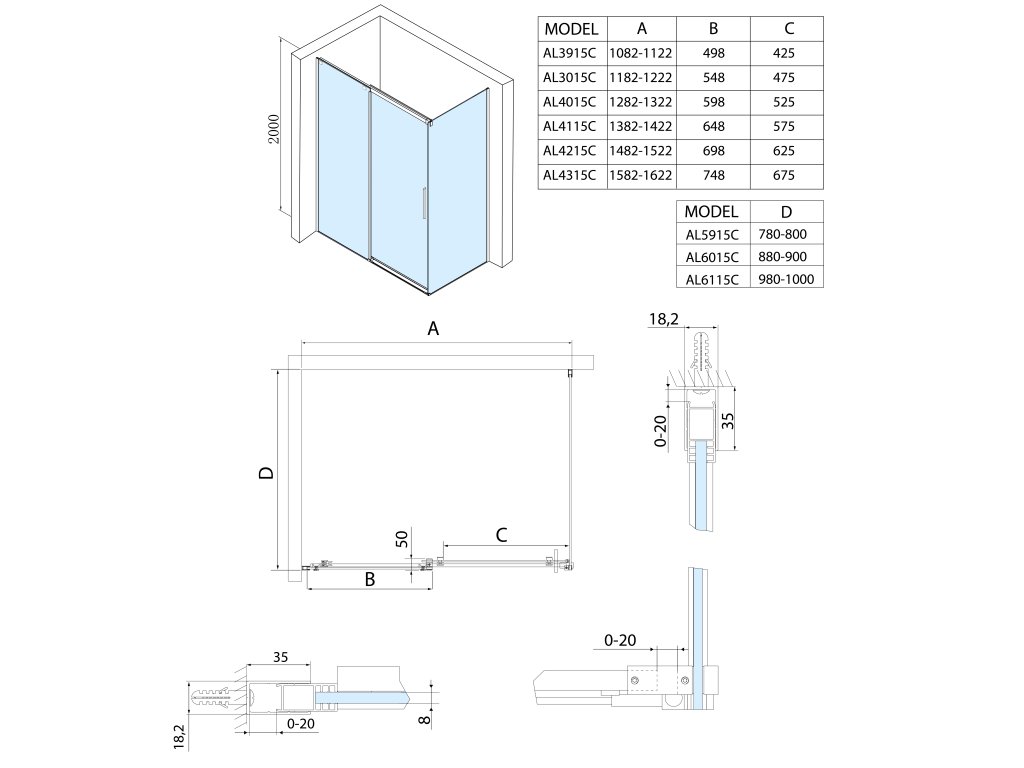 - Dveře jsou děleny na část posuvnou a část pevnou - umožňují variabilní instalaci s levým nebo pravým otevíráním.