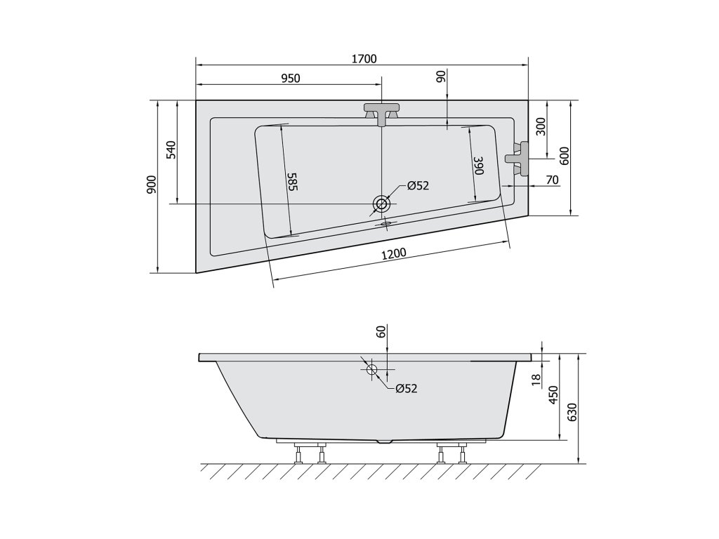 Polysan ANDRA L SLIM asymetrická vana 170x90x45cm, bílá 81111S