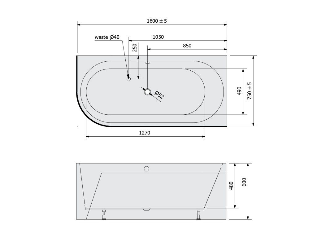 Polysan ASTRA R MONOLITH asymetrická vana 160x75x60cm, bílá/agila 34611M.43