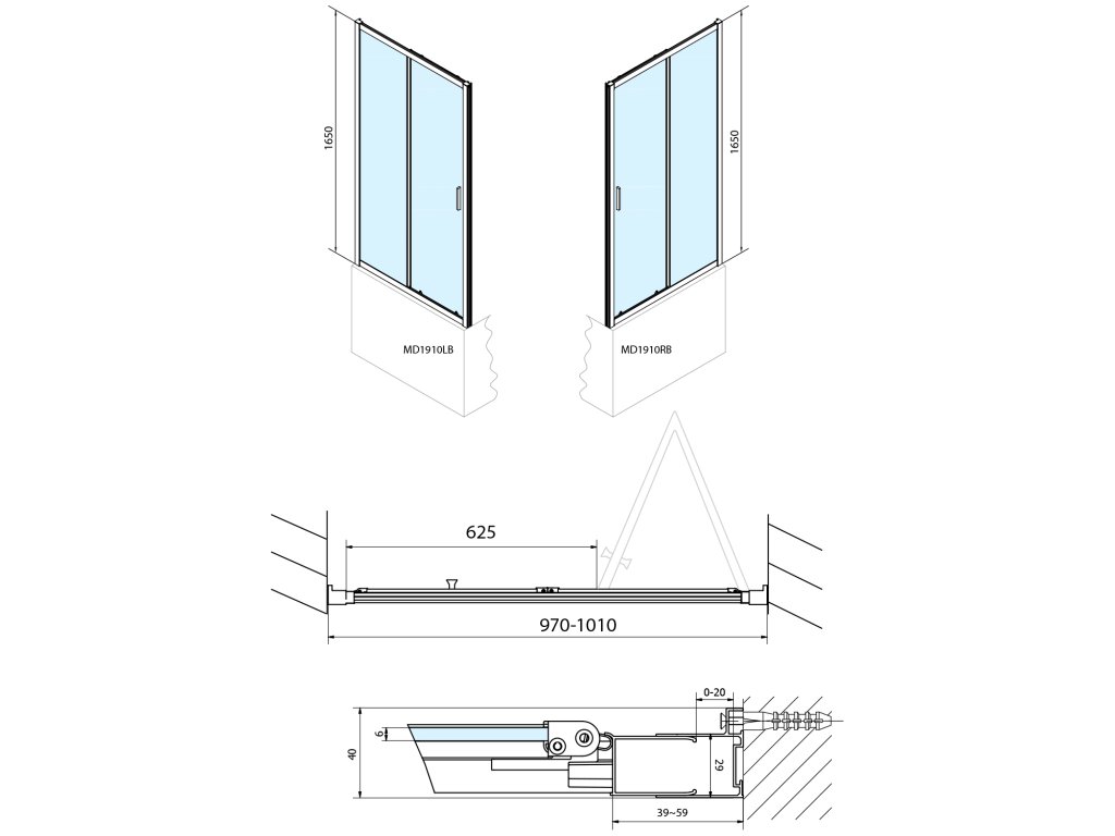 - Dveře jsou děleny na část posuvnou a část pevnou - umožňují variabilní instalaci s levým nebo pravým otevíráním