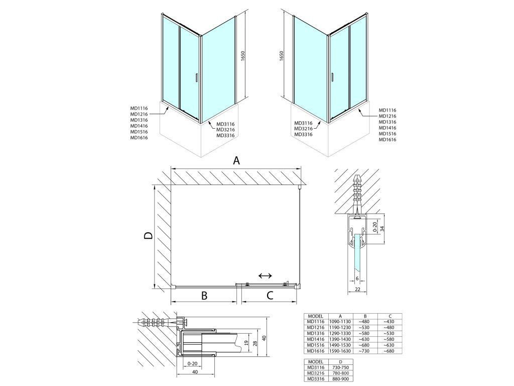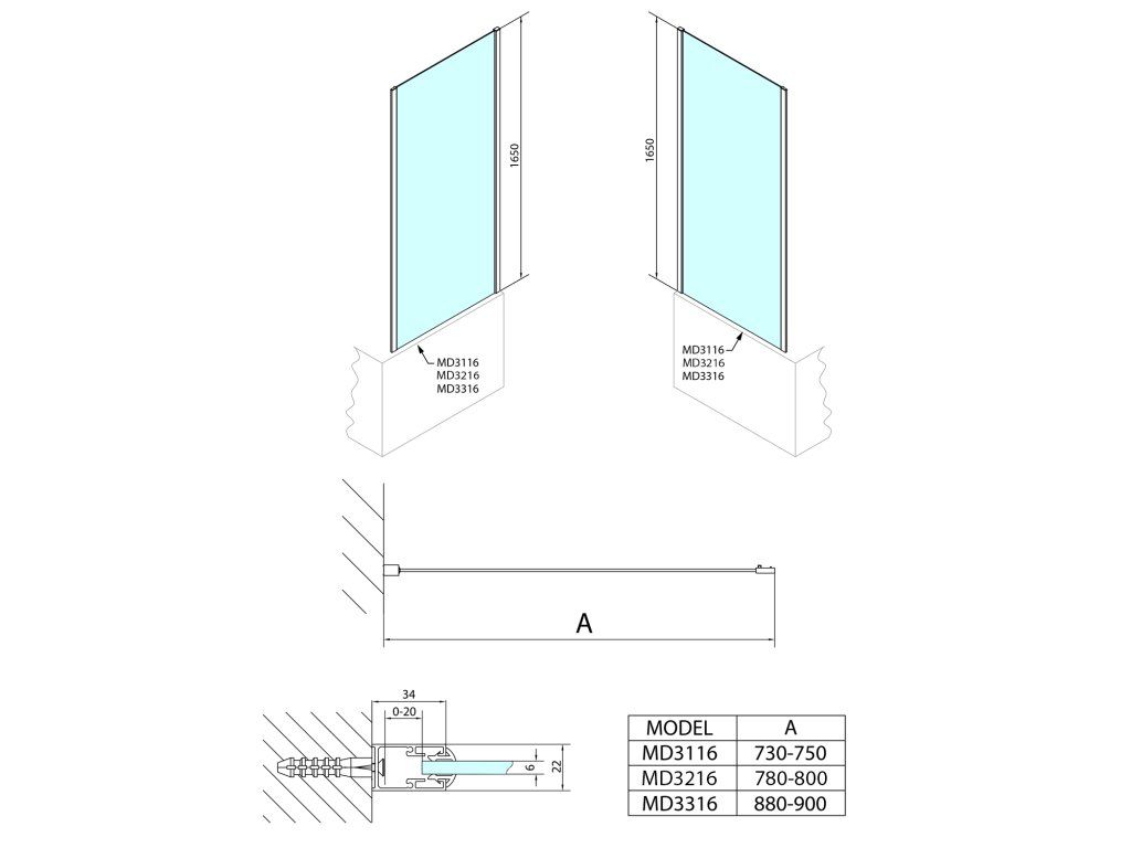 - Snadná montáž, tolerance 20 mm nastavením skel v profilu