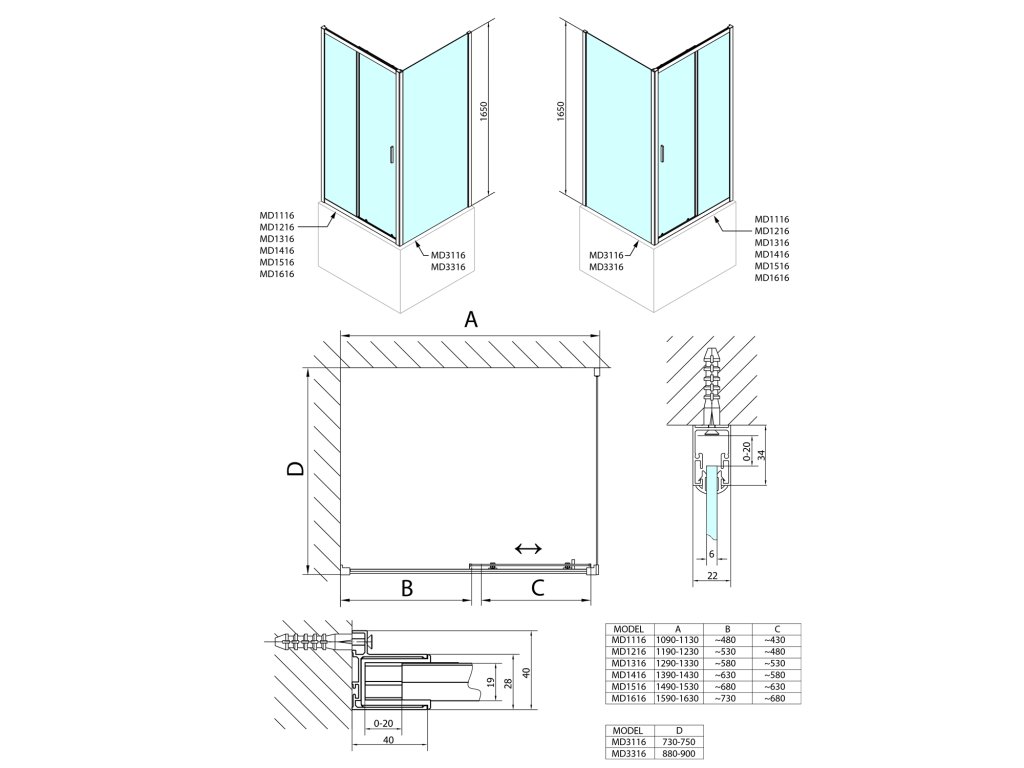 - Snadná montáž, tolerance 20 mm nastavením skel v profilu