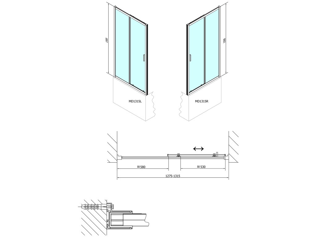 - Dveře jsou děleny na část posuvnou a část pevnou - umožňují variabilní instalaci s levým nebo pravým otevíráním