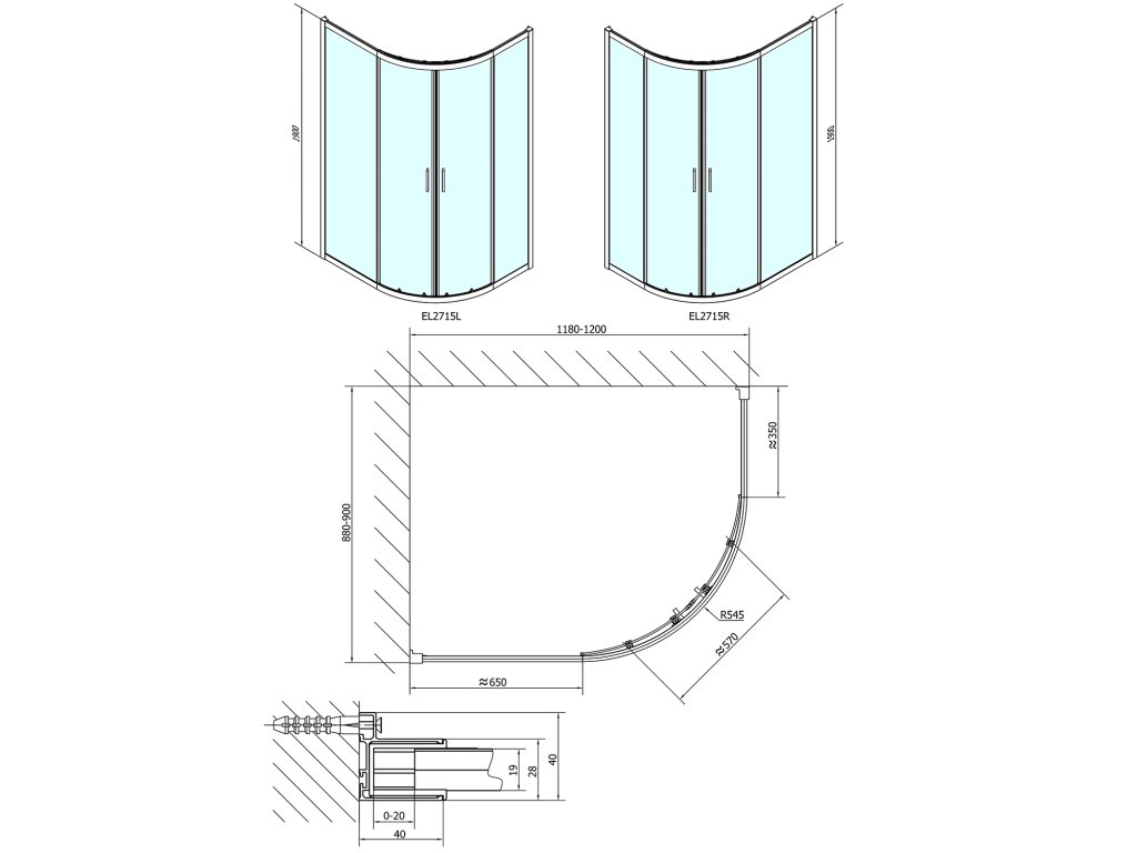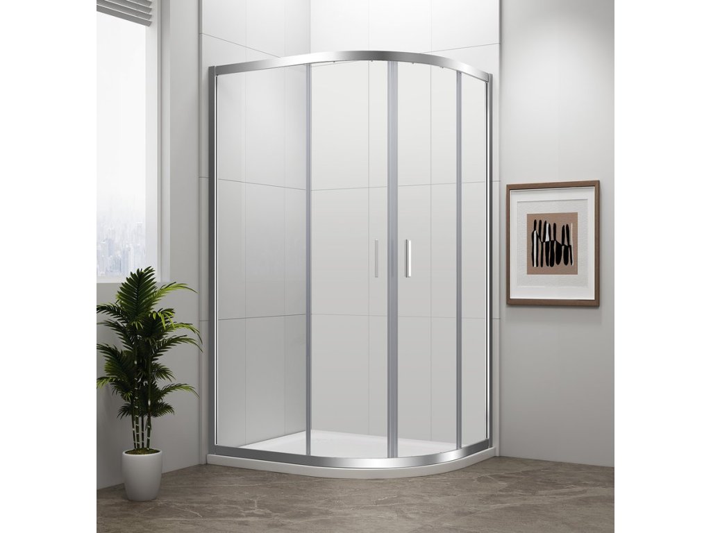 - Čtvrtkruhové zástěny s dvoudílnými posuvnými obloukovými dveřmi, rohový vstup