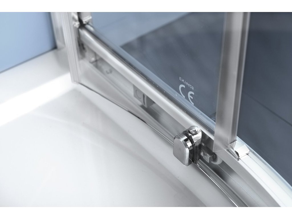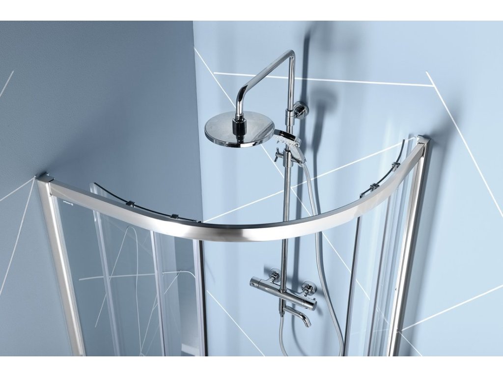 - Čtvrtkruhové zástěny s dvoudílnými posuvnými obloukovými dveřmi, rohový vstup