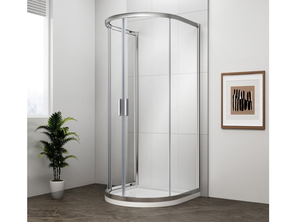 - Čtvrtkruhové zástěny s dvoudílnými posuvnými obloukovými dveřmi, rohový vstup
