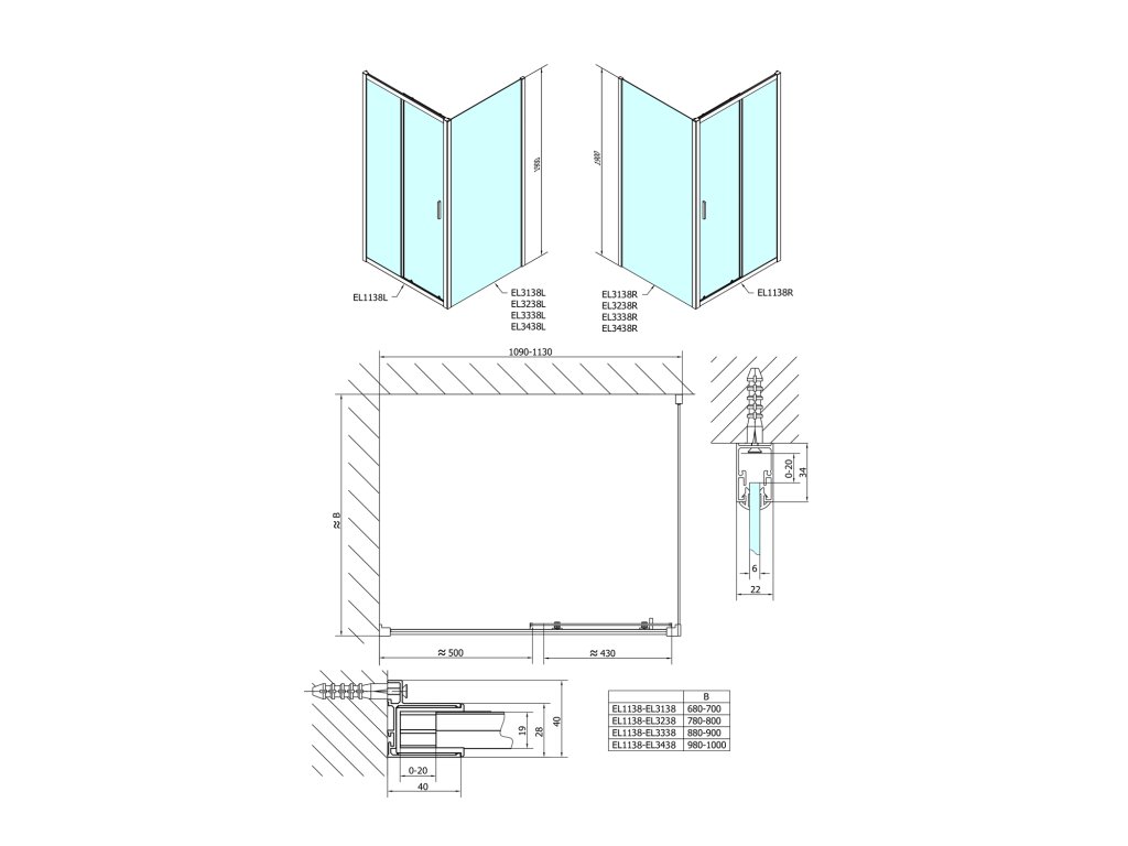 - Instalační rozměr dveří do niky lze díky rozšiřovacímu profilu EL825 zvětšit o 25 mm na každou stranu, celkem o 50 mm