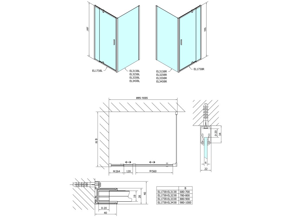 - Instalační rozměr dveří do niky lze díky rozšiřovacímu profilu EL825 zvětšit o 25 mm na každou stranu, celkem o 50 mm