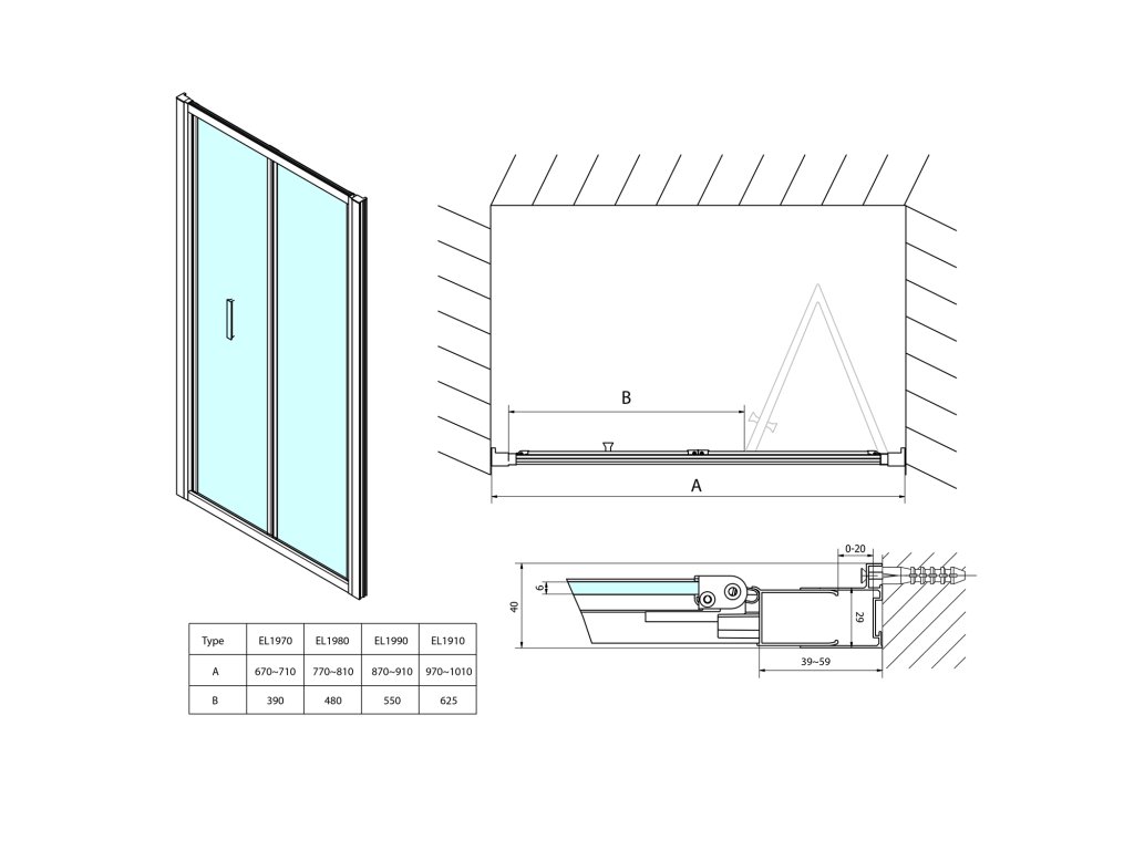 - Snadná montáž, u posuvných a skládacích dveří tolerance 20 mm nastavením skel v profilu