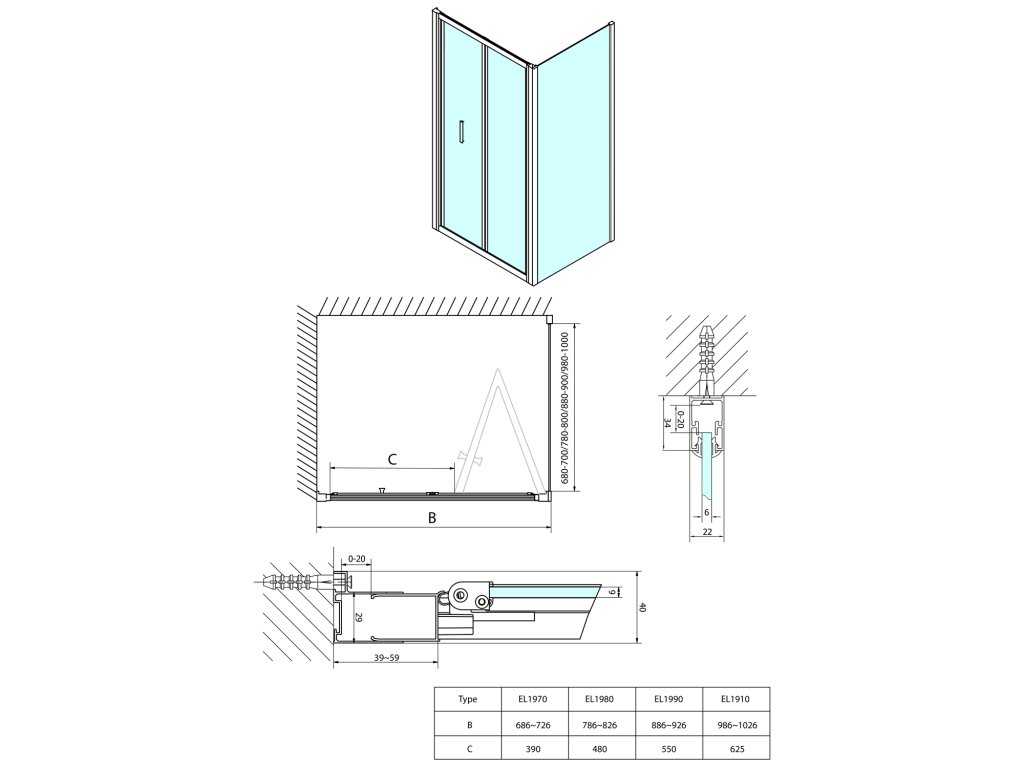 - Instalační rozměr dveří do niky lze díky rozšiřovacímu profilu EL825 zvětšit o 25 mm na každou stranu, celkem o 50 mm