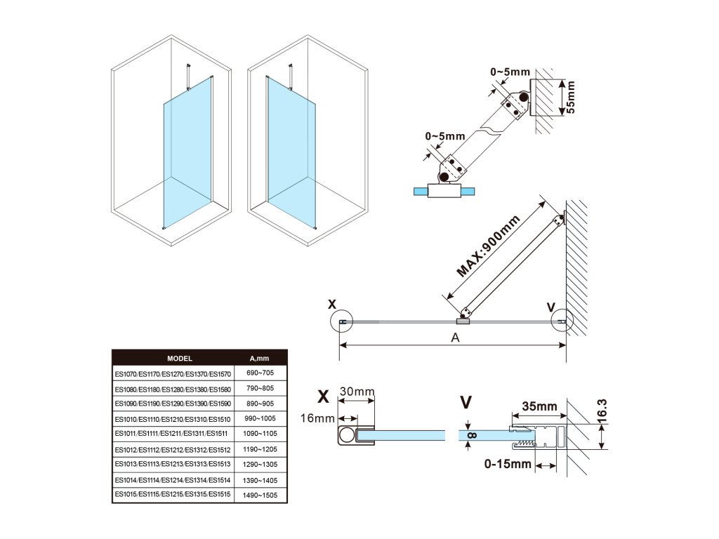 - Stěnové profily s tolerancí 15 mm usnadňují stabilní montáž zástěn, instalace je možná na dlažbu nebo sprchovou vaničku
