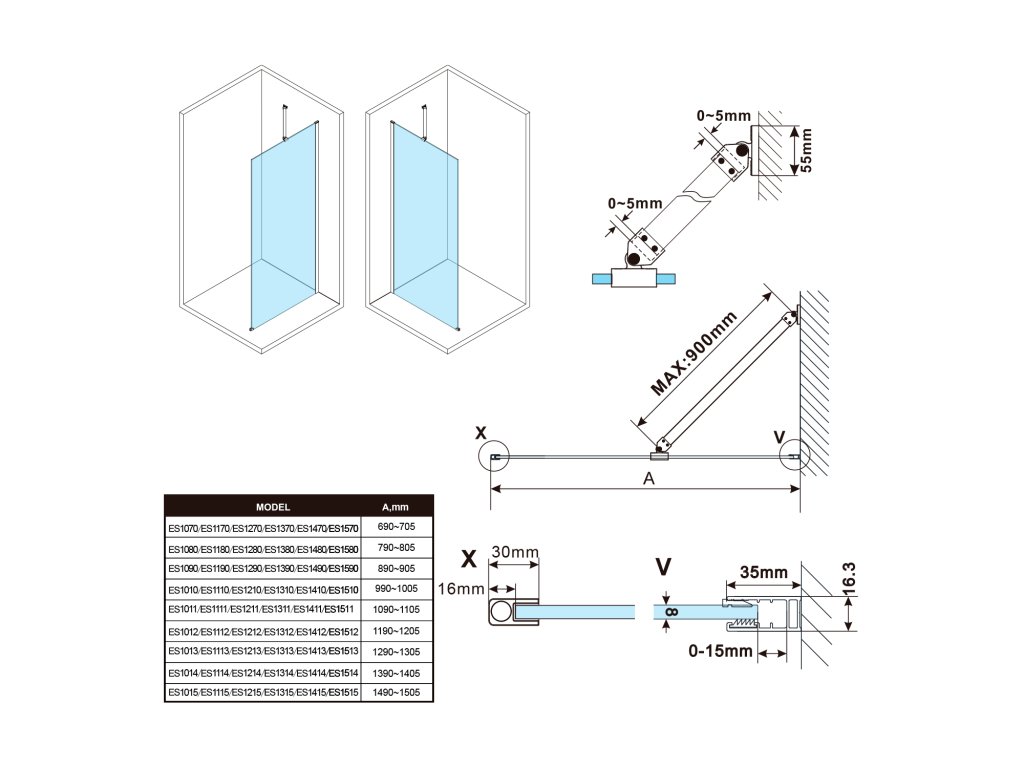 - Stěnové profily s tolerancí 15 mm usnadňují stabilní montáž zástěn, instalace je možná na dlažbu nebo sprchovou vaničku