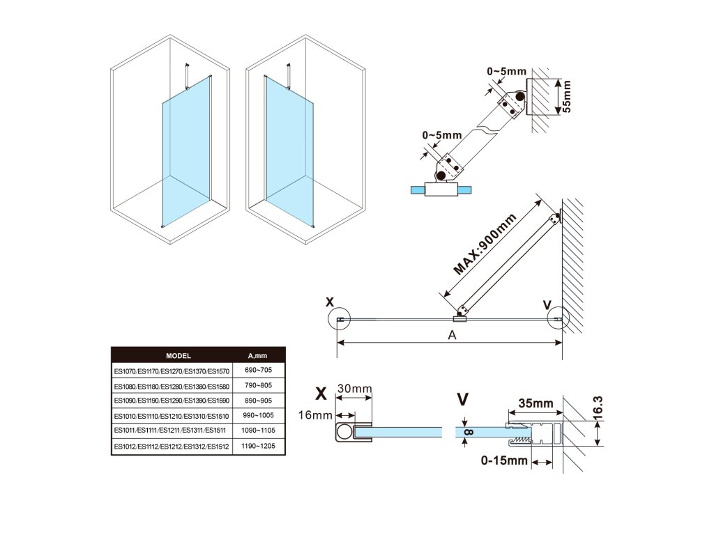 - Stěnové profily s tolerancí 15 mm usnadňují stabilní montáž zástěn, instalace je možná na dlažbu nebo sprchovou vaničku