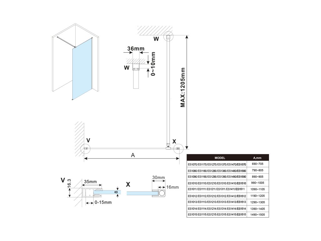 - Stěnové profily s tolerancí 15 mm usnadňují stabilní montáž zástěn, instalace je možná na dlažbu nebo sprchovou vaničku