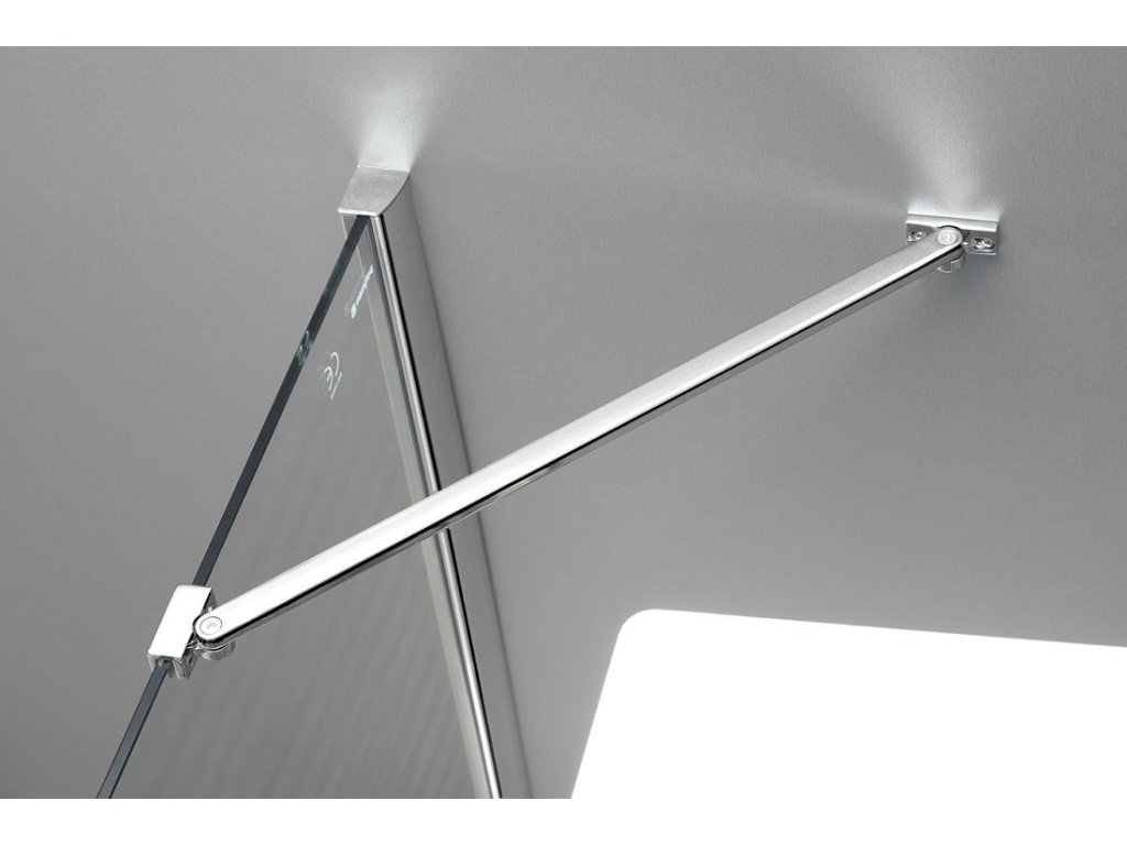 Pochromované madlo Mosazné pochromované panty se zvedací funkcí... ... z vnitřní strany zapuštěné do skla Stabilitu zástěn zajišťuje rohová vzpěra