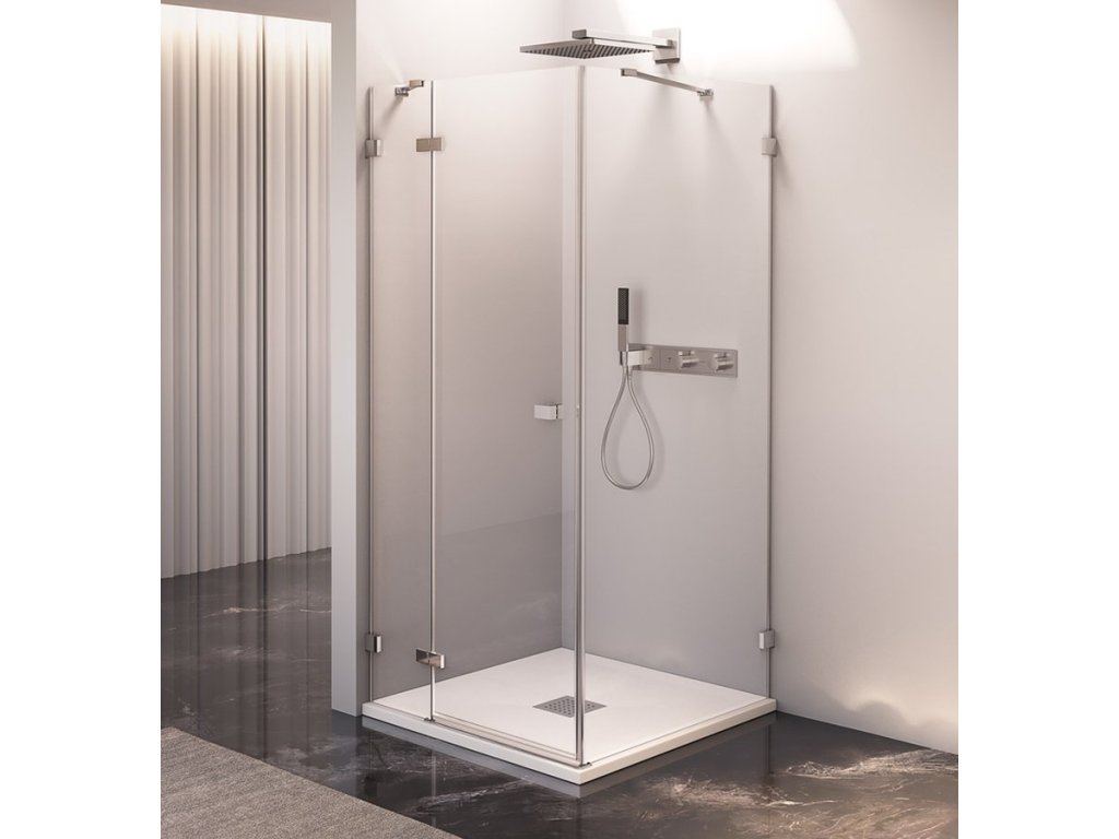 Bezprofilové pantové zástěny FORTIS EDGE v moderním hranatém designu. Minimalistické pochromované panty v nekompromisním hranatém designu, zevnitř zapuštěné pro snadné čištění a se zvedací funkcí pro pohodlné otevírání. Bezpečnostní čiré sklo v tloušťce 8 mm je ošetřené povrchovou úpravou ANTIDROP pro snadné čištění. Výška 2000 mm. Hranaté pochromované madlo ve stejném minimalistickém designu jako panty.