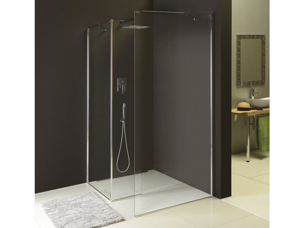 Aby vznikla dvoudílná zástěna ve tvaru "L", je potřeba k pevné stěně dokoupit přídavný pevný panel MS2B.