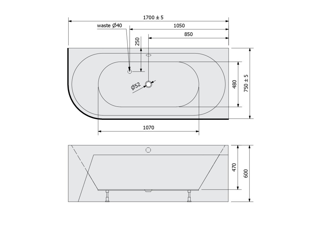 Polysan VIVA R MONOLITH asymetrická vana 170x75x60cm, bílá/černá 78119MB