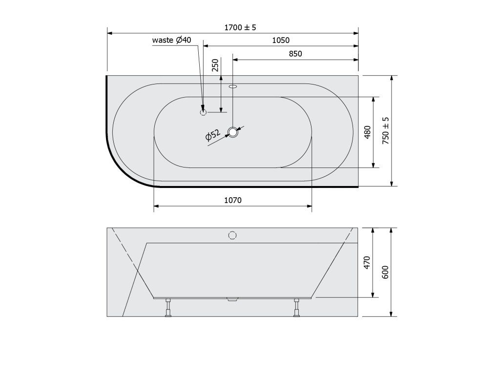 Polysan VIVA R MONOLITH asymetrická vana 170x75x60cm, šedá 78119M.30