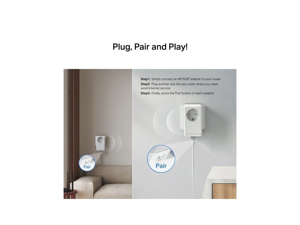 Stačí jeden adaptér připojit k routeru a zapojit do zásuvky, druhý připojit k zařízení v jiné místnosti – a stisknout tlačítko „Pair“. Během okamžiku máte síť připravenou k použití. Plug & Play řešení bez složité konfigurace.
