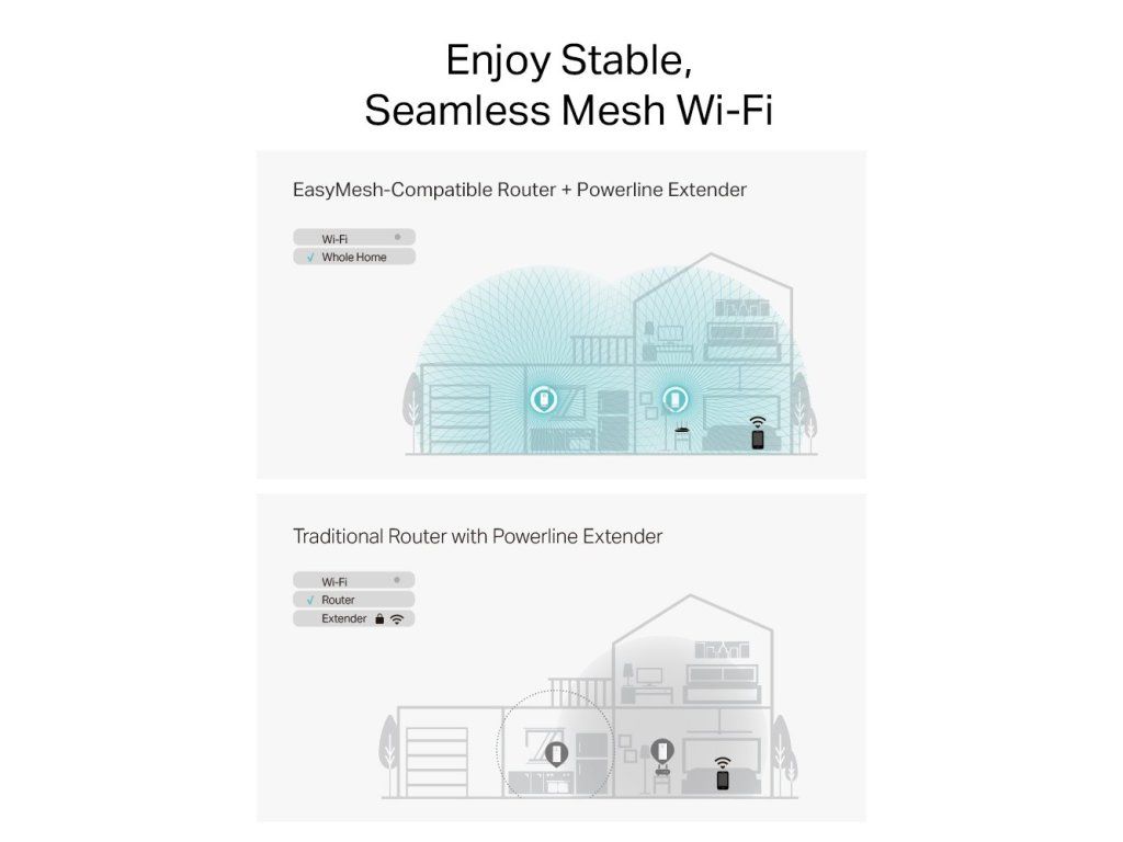 Adaptér podporuje EasyMesh technologii. Pohybujte se se svým chytrým mobilním telefonem, tabletem nebo notebookem po domácnosti, aniž by došlo k výpadku připojení. Odstraníte mrtvé zóny a Wi-Fi síť funguje pod jedním názvem.
