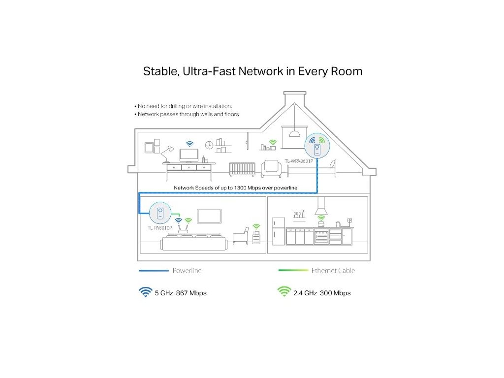 Dvojice zařízení rozšíří vaše internetové připojení do vybrané místnosti v domě pomocí stávající elektrické sítě. Poskytuje vysokorychlostní přenos dat rychlostí až 1300 Mbit/s a rychlost bezdrátového připojení až 867 Mbit/s v 5 GHz a 300 Mbps v 2,4 GHz.