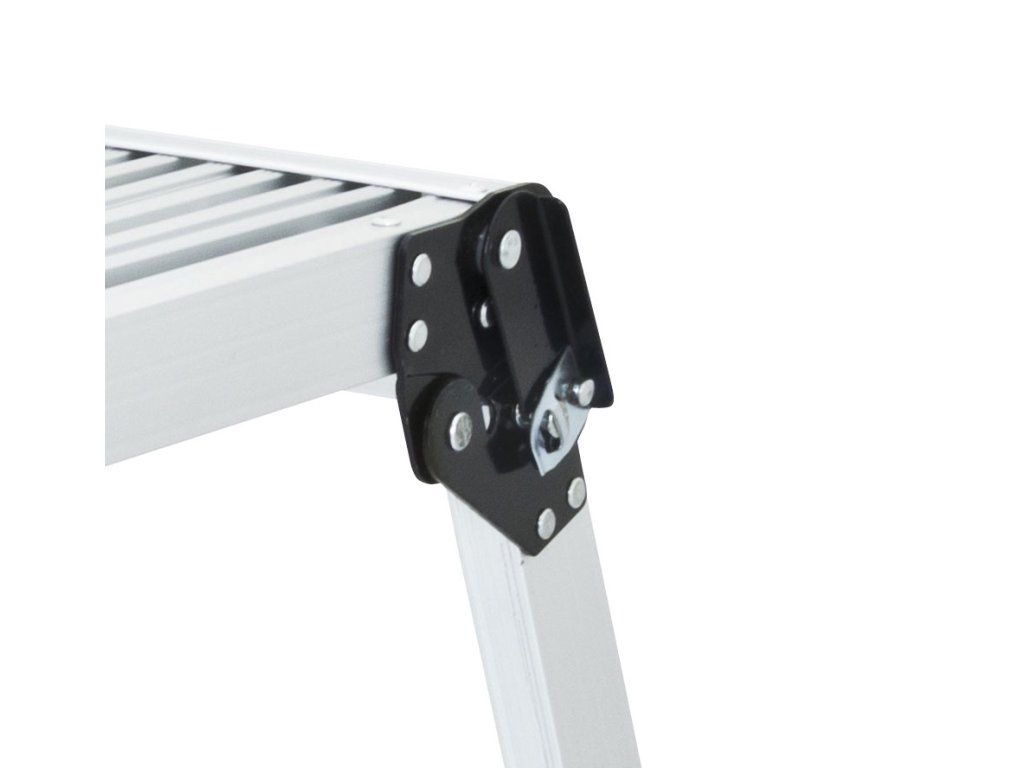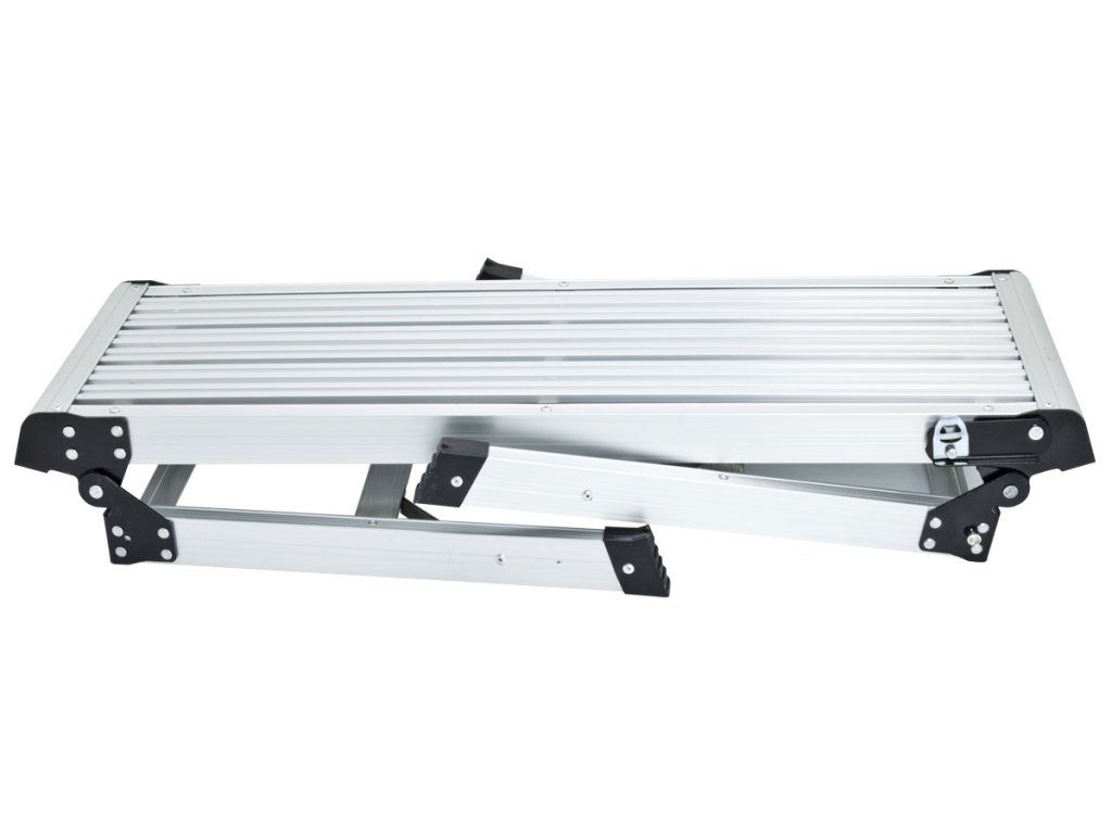 Díky vysoké kompaktnosti je plošinu snadné přemístit kamkoliv, kde je zrovna zapotřebí. Pracovní plošinu snadno převezete v dodávce, ale také v kufru osobního automobilu. Plošina má po složení rozměry pouhých 85 x 40 x 15 cm, proto ji bez problému uložíte do špajzu, do úložného prostoru postele i do rohu v dílně. Hliníkovou plošinu využijete jak v rodinném, tak v panelovém domě.