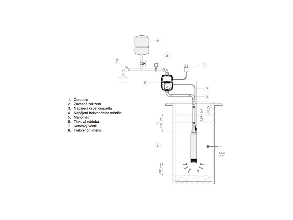 - Frekvenční měnič má v sobě zabudovaný snímač tlaku a zpětný ventil.