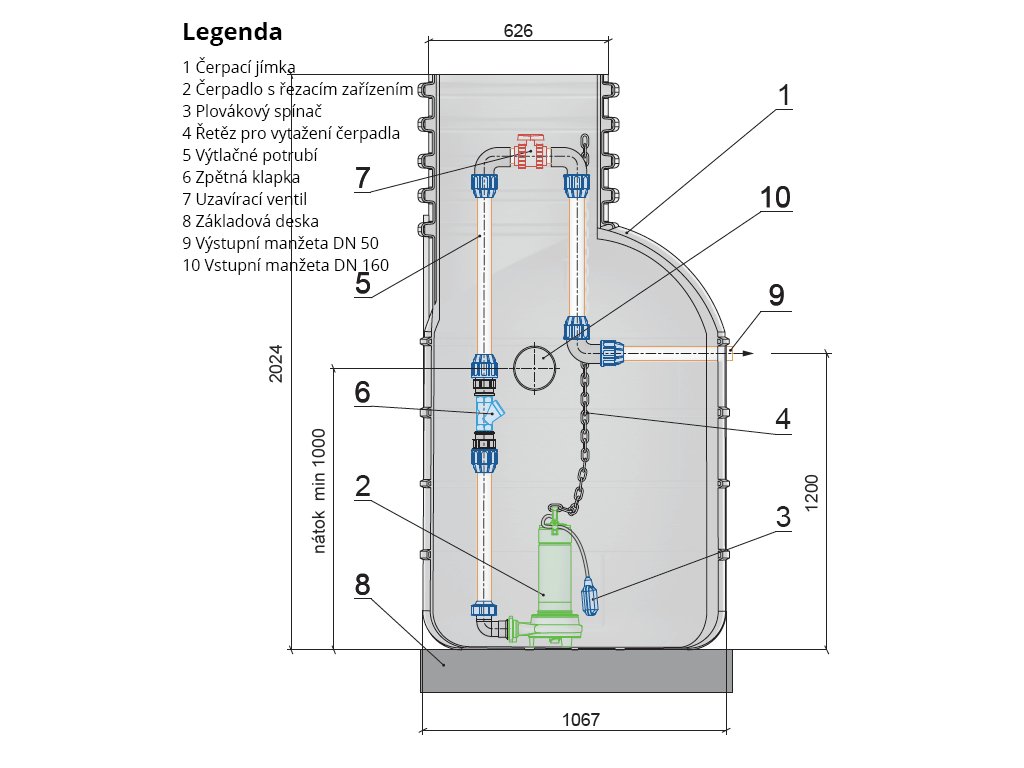 Čerpací jímka 1VP GQGM je určena pro čerpání splaškových vod z rodinných domů, rekreačních objektů, obytných celků, průmyslových provozů apod.. Čerpací šachta je vyrobena z materiálu PHDE a je osazena ponorným odstředivým čerpadlem Calpeda GQGM s řezacím zařízením, které je řízeno plovákovým spínačem. Čerpadlo je vybaveno 10m kabelem, který je zakončen vidlicí (určeno pro zapojení přímo do zásuvky). Čerpací jímku 1VP GQGM je možné vybavit havarijním snímáním hladiny a dalším příslušenstvím.