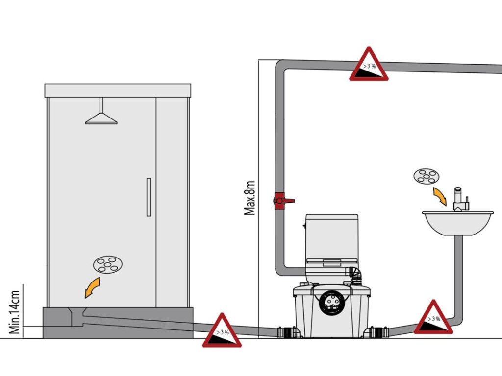 - pro čerpání odpadních vod z WC s dalšími 3 přívody pro odvádění vody ze sprchového koutu, umyvadla a/nebo bidetu pod úrovní kanalizace nebo v souvislosti s rekonstrukcí nebo modernizací stávajících budov, kde nelze vytvořit přirozený spád potrubí