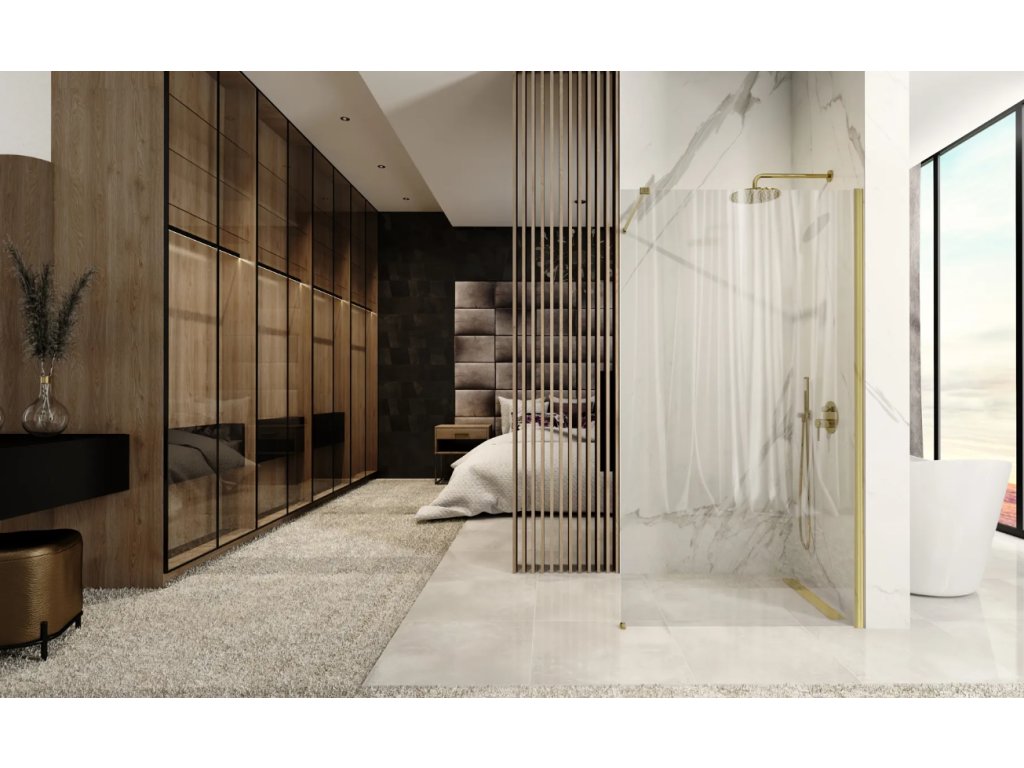 Designová varianta sprchového koutu Walk In se zlatými profily, která se řadí mezi nejmodernější trend ve vybavení koupelen. Jedná se o otevřený sprchový kout, tvořený jednou stěnou z bezpečnostního tvrzeného skla, zabraňující nechtěnému rozstřiku vody. Povrchová úprava Easy Clean zabraňující usazování nečistot a tvorbě tzv. map po stékající vodě na skle. Voda je odváděna odtokovým kanálkem, umístěným v podlaze. Univerzální provedení pravé nebo levé varianty si dle potřeby zvolíte při montáži. Zlaté prvky jsou laserem čtyřikrát potaženy povlakem nejvyšší kvality. Díky této technice jsou hliníkové profily chráněny proti korozi, poškození a zabarvení. Sprchový kout Aero dodá Vaši koupelně na moderním a čistém vzhledu a Vaše koupelna získá ojedinělý designový nádech v nejmodernějším trendu.