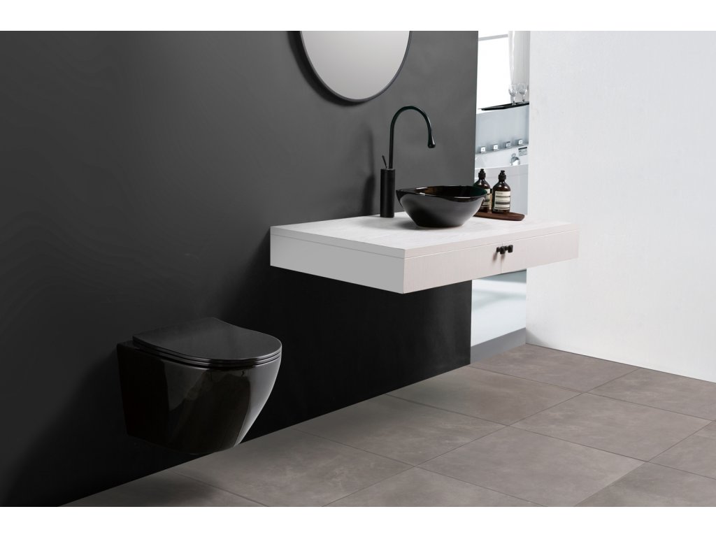 Stylová toaletní mísa Carlo Mini v černé barvě vyrobena z vysoce kvalitní sanitární keramiky. Díky speciální fázi výroby je mísa odolná a snadno se čistí.