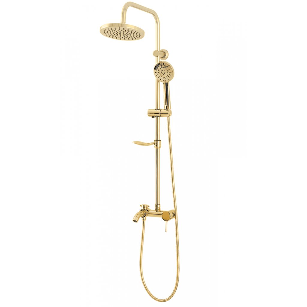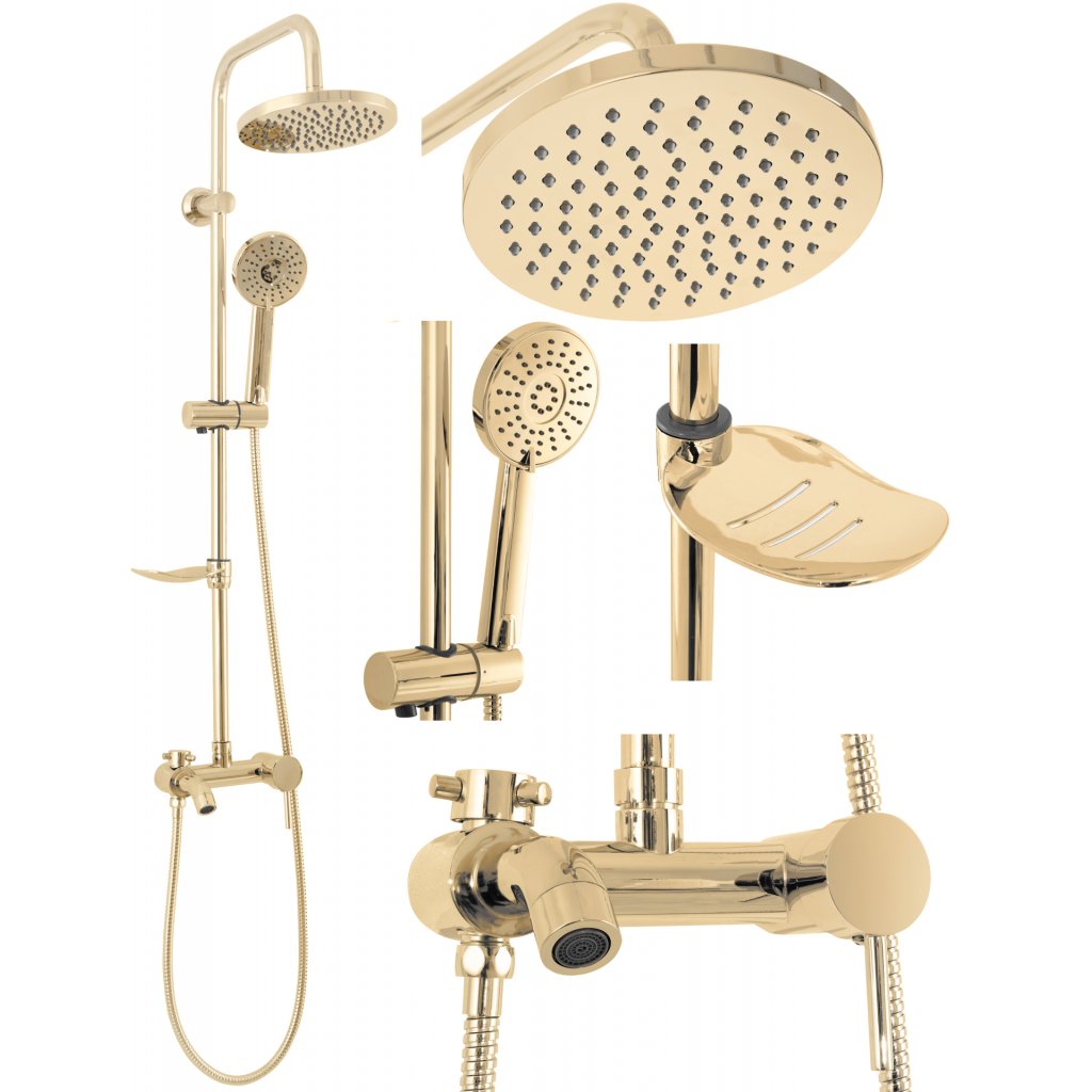 Sprchový set Luis včetně baterie - celý ve zlaté lesklé barvě. Hodí se do klasické, moderní i retro koupelny. Moderní jedinečný design a vysoká kvalita použitých materiálů zaručují dlouhou životnost a spolehlivost. Díky sprchovému setu Luis zažijete pohodlí při každodenním sprchování. Součástí je hlavová sprcha (dešťová sprcha), ruční sprcha, hadice, baterie a mýdlenka.