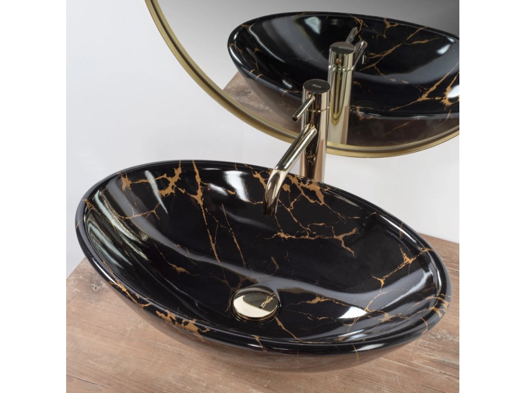 Designové umyvadlo na desku Pamela v černé ve vysokém lesku se zlatými žilami. Nadčasový tvar a rozměry umožní dokonalé uspořádání i v malých koupelnách. Umyvadlo je vyrobeno z vysoce kvalitní keramiky, která zaručuje bezchybný vzhled a použití po celá léta. Díky speciální povrchové úpravě je odolné a snadno se čistí.