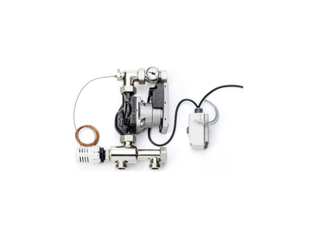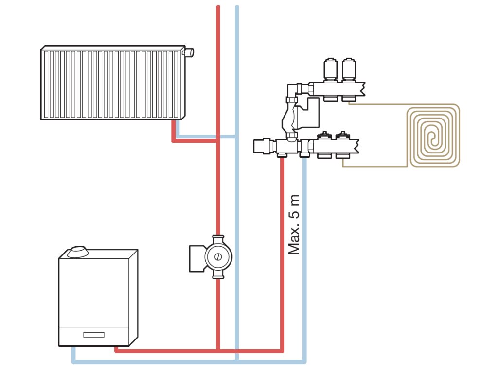 Funkce REHAU regulační sady FLEXŘízený přívod vysokoteplotní topné vody (např. 70 ° C) z primárního okruhu snižuje výstupní teplotu na úroveň podlahového vytápění přimícháním chladnější vratné vody podlahového vytápění. Hydraulický okruh pracuje na principu přimíchávání. V závislosti na velikosti rozdělovače by měla být teplota primárního okruhu nejméně o 10 °C až 15 °C vyšší, než je požadovaná teplota pro podlahové vytápění. Bezpečnostní omezovač teploty vypne čerpadlo topného okruhu při překročení nastavené teploty (např. 55 °C). | |||||||||||||